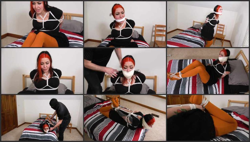 When Zahn tells Riley he’s planned a party at their place tonight, she does not take the news well. She tells him to call it off, even threatening to call the police to break it up if he insists on having it. The invites have already been sent and the supplies purchased so it’s too late to cancel it. Instead, Zahn decides he’ll have to keep Riley out of the way and quiet during the gathering. He grabs her and drags her upstairs, and quickly has her bound at her wrists, chest, ankles, and feet on her bed (tying done off-screen). Obviously, Riley isn’t happy about this so Zahn quiets her complaining mouth by filling it with a big red bandana and tying a thick white cloth between her teeth. Zahn goes downstairs to prepare for the party, planning on listening for sounds of Riley in case she needs further muffling. Riley tries her best to escape, hopping around and rolling on the bed, showing off her orange tights under her dress. She is, indeed, still too loud so Zahn has to change her gag, packing her mouth full with a huge pair of pink nylon panties and sealing them in with 4-inch microfoam tape wrapped over her lower face. That seems to do the trick but she’s still moving around too much so Zahn hogties her on her bed after a few more minutes of struggling. Now tightly trussed and wrapped, Riley won’t be interrupting anyone’s fun.