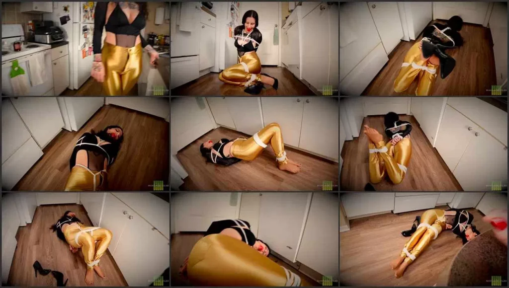 Bad gal MILF Elli Raven has just moved into the neighborhood, and her college age neighbor is very curious about her. So, he whips up some lame excuse about needing to borrow a cup of sugar & heads over to her place. She greets him at the door, and after seeing how handsome he is, she asks him to help her with a little something. She instructs him to grab some rope that’s in the next room & then shows him how to tie her up (off screen). When Elli is in her final tie, she tells the pov that she’s still missing something. The final scene opens up with Elli on the floor struggling with a red ball gag in her mouth. She seductively moves around while moaning, making sure to show off all of her sexy curves for her neighbor.