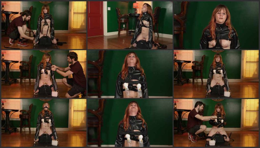 Peaches steps up to the Sybian, strips, and then gets cuffed at her thighs to a bondage board alone with an open breasted straight jacket to bind her arms, so now she cannot escape the Sybian. The Sybian slowly revs up over time, increasing her stimulation, as milking breast pumps are attached to her nipples, slowly draining the milk from her full lactating breasts. An open mouth gag is added as the drool spills, the milk leaks, and Peaches is brought to orgasms.