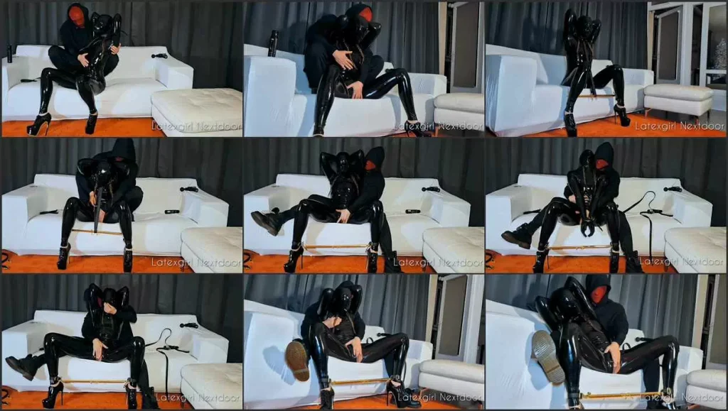 After enduring the first 20+ minutes of cruel leather bondage, with my pussy exposed, I try to catch my breath underneath the tight rubber mask clinging to my face. I hear the metal clattering of the spreader bar between my legs, a stark reminder my exposed pussy is at the mercy of my Master. Sensitive and swolen, each stroke of his fingers against my clit feel intensified, and it doesnt take long before I come. Heaving and moaning underneath my rubber second skin, I feel Master’s hard cock pressing against my latex clad buttocks.