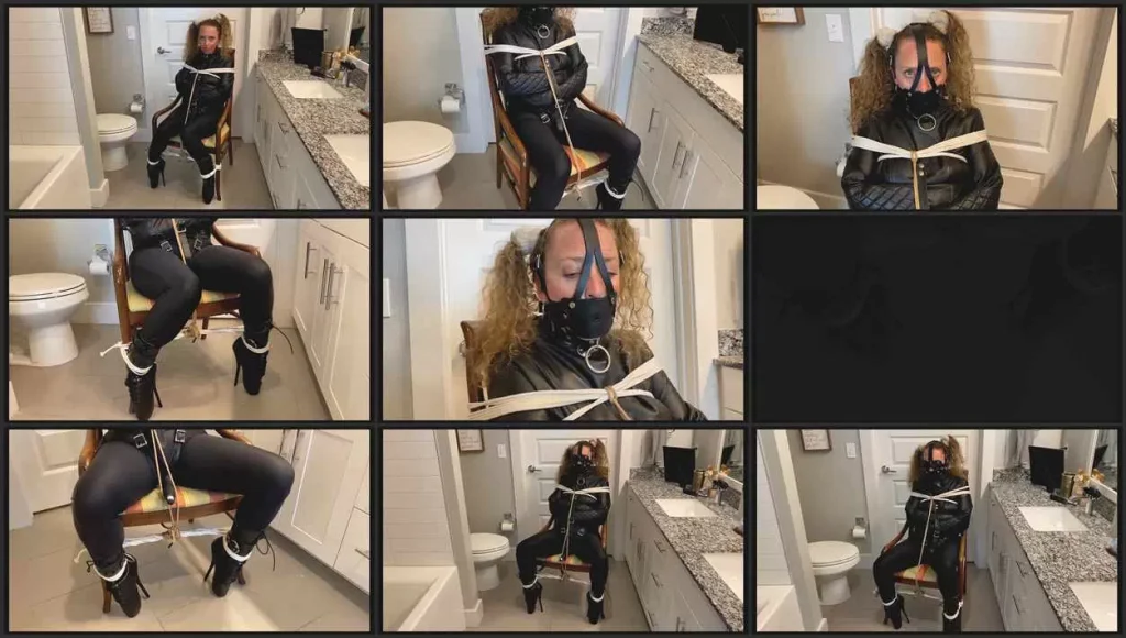 Grabbing drinks with my buddies used to be fun until I noticed my gal Taylor stalking us everywhere we went. She’ll hide in the bushes, or a behind a tree or a car, and it’s become a problem. Well tonight is another hangout and I decide enough is enough. I bait Taylor into believing that I’m shooting a dramatic scene for school that includes a straitjacket and rope restraints. I also tell her it would be fun to see her in our favorite fetish leather ballet boots tied up to the chair too. She takes the bait and in the process I gag her with a bandana stuffed inside her mouth, tape to keep it in and a leather head harness to make sure the neighbors won’t hear anything. Little does she know is that she’ll be spending the evening in it. When I come home later that night, I decide to reward her for her good behavior.