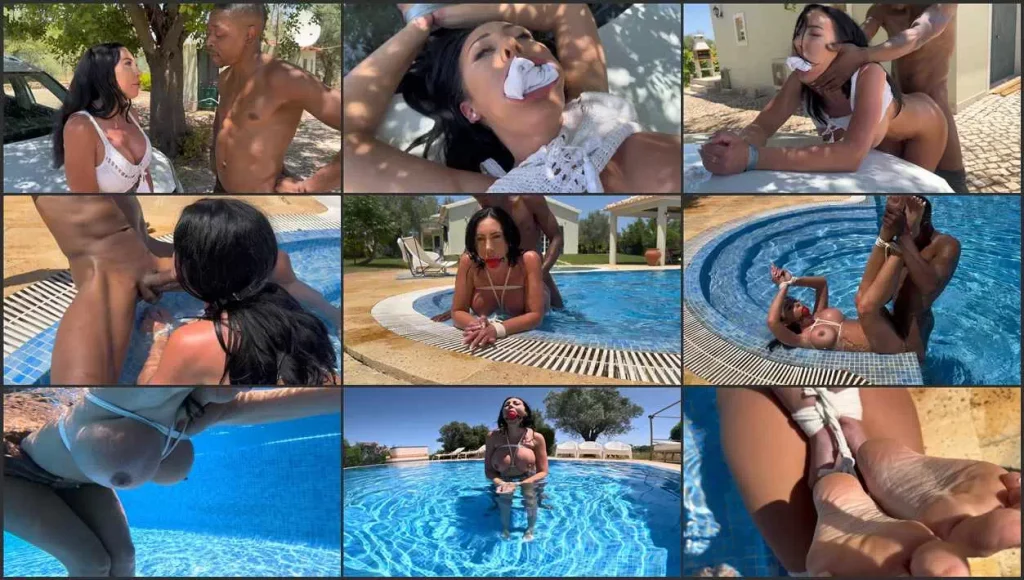 Mila has been walking for hours in the hot sun and comes across a huge villa. She doesn’t realise this villa belongs to a villain! as she approaches trips the alarm. The villain jumps up and checks his security cameras. He watches as Mila enters his property. She knocks on the door and asks if he could help. He agrees and tells her to come in, with her guard down he swiftly grabs her arms and places his hand over her mouth dragging her away. Mila is now at his car taped at her wrists and ankles he shoves a white cloth into her mouth and gropes her gorgeous body. He pushes her back onto the hood of the car and pulls down her shorts eating her wet pussy. With his huge black cock fully erect he fucks her on the car. She moans as she struggles to take every inch of his massive dick. He flips her into Doggystyle and continues pounding her before picking her up over his shoulder and arraying her off. Mila is now naked with a tight rope chest harness on, wrists and ankles tied. She has a huge red ball gag in and is kneeling in the pool. The villain wipes his cock on her gag making it throb as Milas eyes bulge and she drools. He removes the gag and fucks her face. She gags as she deep throats him drooling into the pool. He walks down the steps and enters the water laying her on her back, replacing the ball gag as shes partially submerged and fucks her again. He takes her deeper and fucks her underwater then stands her up. She faces the camera and he pounds her from behind. Suddenly he grabs her head and dunks her into the pool…