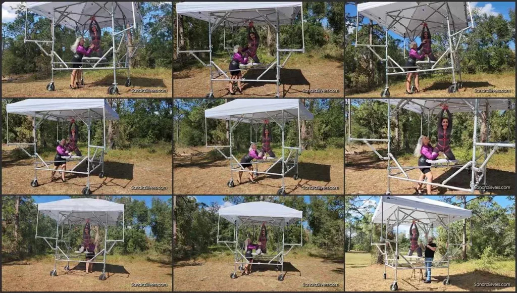 Whitney Morgan is utterly trapped under the white canopy tent, her body suspended in a brilliantly cruel display of engineering and desire. Pink nylon ropes dig into Whitney’s see-through silver Winterfetish catsuit, arms wrenched above her head, leaving her trembling in semi-suspension, kneeling on a platform high off the ground. Every squirm sends a shock through her bound form, especially with her high heels tied to the crotch rope, forcing her into a non-negotiable kneeling position that makes her whimper around the giant pink ball gag.