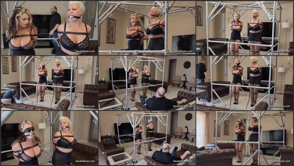 Sandra Silvers and Goldie Blair are engineered for ecstasy in this relentless MILF bondage masterpiece! Strapped mercilessly into The Department of Bengineering’s infamous M.O.N.S.T.A.R.* System frame, their luscious, tanned bodies gleam against cold steel, leather straps biting into tender thighs and ankles as they struggle helplessly. Giant hands, as strong as the metal that holds them firm in standing pole-tied prisons, gives each gal a generous groping. Squeezing gigantic globes barely contained in lace bras, stroking smooth skin and wide hips encased in open bottom girdles, garters attached to silky stockings. Silver ball gags stifle the women’s whimpers, and a later addition of padded blindfolds help to heighten every torturous sensation, sight unseen…