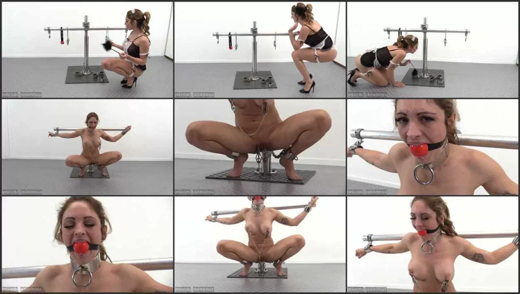 Alba Zevon is the new maid here in the studio. She comes across a curious device with a lot of accessories. Cuffs, clamps, a gag, collar… Alba thinks it is very strange but she dutifully dusts off all of the gear. She can’t stop wondering what the metal cross is for. Fortunately, she doesn’t have to wonder very long… before she knows it SHE is the one locked to this cross, in a very hard squatting position that gets more exhausting by the minute! To make things (much) worse she is also nipple clamped and labia clamped! Alba did not sign up for this when she took the job!!