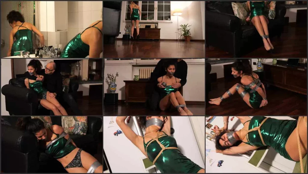 Mayla is an amateur investigator who’s first task is to look for some information that could eventually lead to a big arrest. She’s getting ready to go out for the night but instead gets the tip off to a location where some clues could help her case. She goes straight over and starts snooping around the area. After looking around for a bit, suddenly she is tightly hand gagged from behind by a captor who has been watching her as it was a setup. The scene then cuts to Mayla tied with shiny silver pvc tape. Her wrists are taped behind her back, her ankles are taped together and she’s gagged with a single piece of shiny silver pvc tape (lip prints visible through the tape gag). She’s struggles on a couch for a bit and then the captor returns to explain her situation and how it was a setup. The captor leaves and Mayla struggles some more. She struggles on the couch, then hops around the room eventually making her way to a door trying to open it. The captor then comes back, grabs her and decides to keep her more secure. Mayla is now tied even more with shiny silver pvc tape. Her wrists are taped behind her back, her ankles are taped together, her thighs are taped together, she’s taped around above her chest, taped around below her chest and she’s still gagged with a single piece of silver pvc tape…
