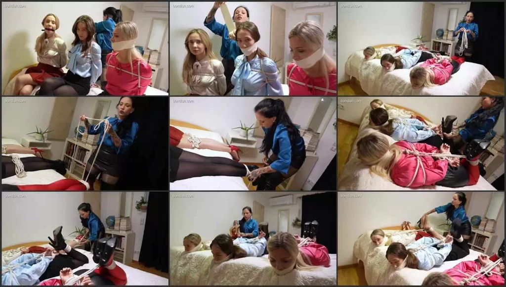 Mira has invited three friends to do what she enjoys most: tying up and gagging girls. Vera is already a bondage enthusiast, and her two friends Isabel and Jennifer have already had their first bondage session and are eager for new bondage experiences. After the girls have been gagged with ballgags and their upper bodies are properly ropes up nice an tight it’s time for the “Fun Part”. The girls get regagged with stockings and microfoam tape and afterwards they get hogtied. And Mira collects their shoes as a trophy before she leaves the party early.