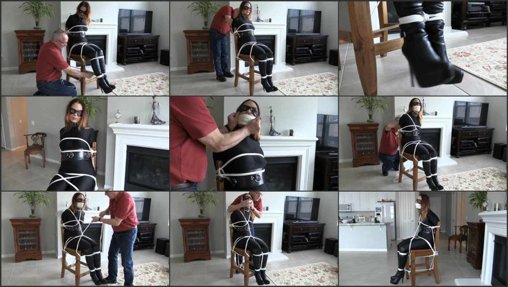 Starring Anna. Mistress is annoyed her boot slave is late. She also vows never to let this disobedient worm tie her up again. Sorry Mistress, but that is what we want to see, so that is what you get. Looking ever so lovely in black spandex catsuit, over knee high heel boots, and a sexy cat woman leather mask, strutting Domme Anna is transformed into a roped to a barstool damsel and she is not happy about it. Slave adds a rope to limit her ankle movement and tension up the chest ropes, then goes off to find a gag. Mistress tries to free herself but she is stuck until slave decides to free her. Numerous angles document her tied up tight situation. Slave returns with mouth stuffing and MicroFoam tape. Mistress resists, motivating slave to pinch her nostrils until she opens her mouth. The tape is stretched as it is applied to her lips and cheeks and pressed on decisively for a good bond. Slave thinks adding more rope will be fun while Mistress is gagged. She gets a long one wound around her body from torso to ankles. With her immobilization complete, slave goes off to buy Mistress new shoes in hopes she will not ban him from her realm. Once again, a series of angles, close and long, are presented for viewer enjoyment. A high heel bribe probably will not work to get slave out of the doghouse, but that is okay. Seeing Mistress tied up and gagged will be a cherished lifetime memory.