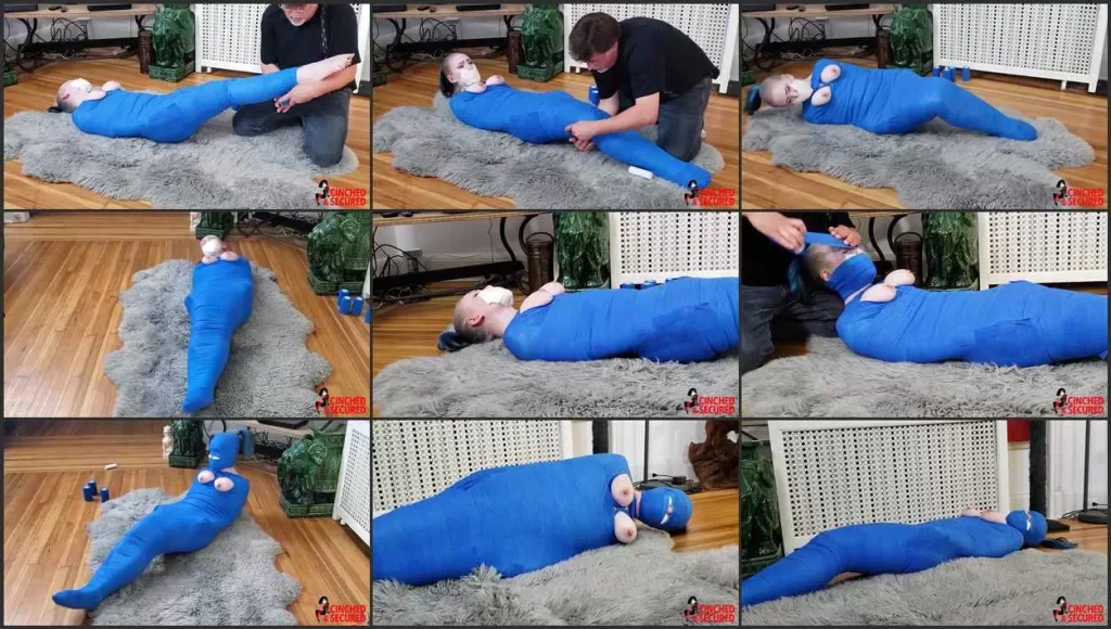 Vonka was quite skeptical about the rash of burglaries that were wreaking havoc in her neighborhood, but she came a believer VERY quickly when she found herself to be the burglar’s latest victim! Wrapped from shoulders to feet, her mouth sealed shut with ultra sticky white tape, the poor girl was left thrashing and struggling, mewling into her packed mouth, her beautiful natural breasts left exposed for the delight of her captor! Things went from bad to worse when he returned to wrap her entire head in the tight blue bandages, leaving only her nose exposed as her pony tail poked from the top like a kinky party favor! Her assailant gave her a chance by tossing a pair of scissors nearby, but unfortunately, as she blindly struggled to access them, she only managed to push them underneath the rug she lay on! Now with no hope of escape, she sobbed and grunted as the burglar decided to add her to the haul he made from her home, and the sightless, silenced package felt a pair of strong hands grabbing her by her ankles as she was off to a horrible new life!