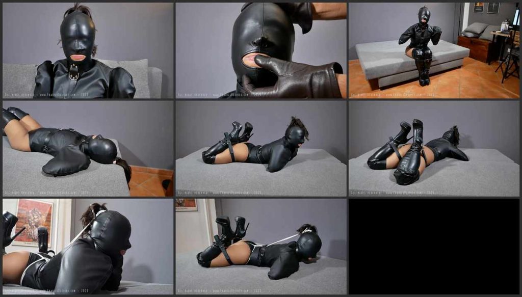In this video, I’m wearing the latest hood I have made. A completely closed model, but with lips exposed. To make it more exciting, I have been gagged with Fixomull Transparent. I’m tied in my straitjacket and wearing beautiful thigh boots. Impossible to resist…