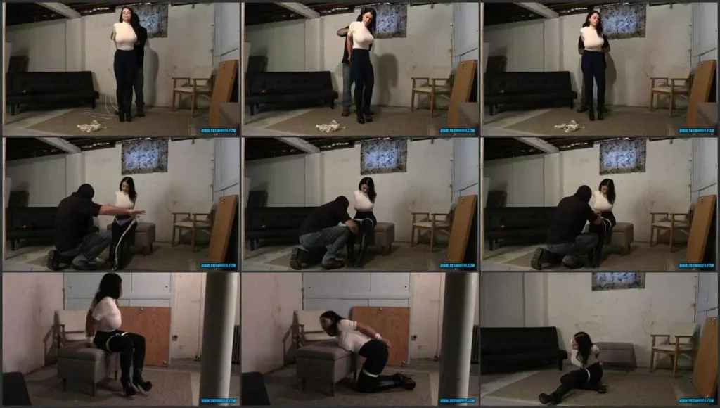 Sexy Nadia White is dressed for some tight bondage! We quickly escort her to the basement dungeon to start her captivity! Nadia looks just fantastic in her skintight outfit and stiletto heeled boots! She was just begging to be bound and gagged!