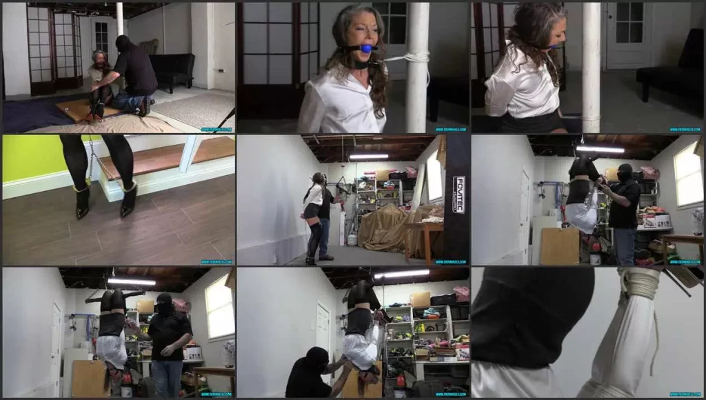 Portia is escorted to the bindery cell where she is tightly hogtied and strung up, upside down on the bindery cell hoist! now she is his and he can do whatever he pleases to her!