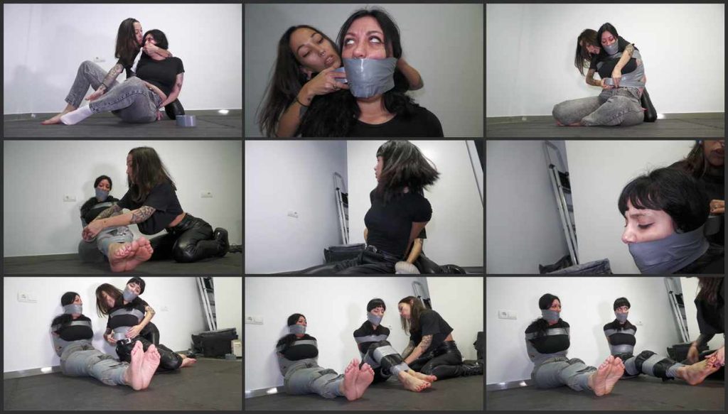 “Of course my dear!”. Pilu ties her hands with tape and handgags her. She removes her socks and gag’s Dyane with the socks and a big tapegag. Then she ties her up with a lot of tape. But then Dyanne’s new roommate, Mayla, arrives.