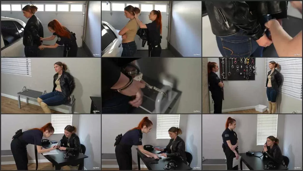 Officer Jackie Jupiter pulls Lauren from the back of her car and removes her cuffs so she can search her. Lauren removes her jacket and Officer Jackie thoroughly searches it before patting her down. Lauren puts her jacket back on and Officer Jackie puts her back in the handcuffs with her hands behind her back. She is brought inside and handcuffed to the bench for a few minutes before Officer Jackie takes her mugshot. She is cuffed to the bench again before Officer Jackie returns to take her to the table to take her information and fingerprints for processing.