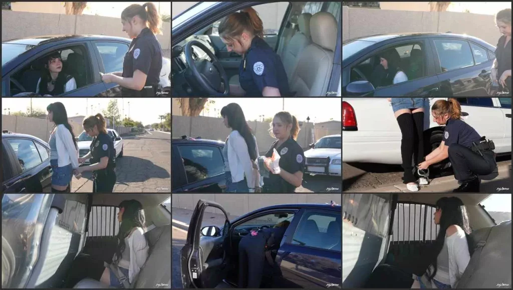 Jocelyn has been pulled over again, and Luna Ray runs her information. She gets word that her license is invalid (suspended) and that she has previous traffic tickets. When Luna returns to Jocelyn’s car, she tells her that she’s going to have to place her under arrest. She handcuffs her hands behind her back, reads her rights, and walks her to the back of her cop car. She has Jocelyn lean against the car while she puts shackles around her ankles. After she’s handcuffed and shackled she is put in the back of the cop car and taken to the station.