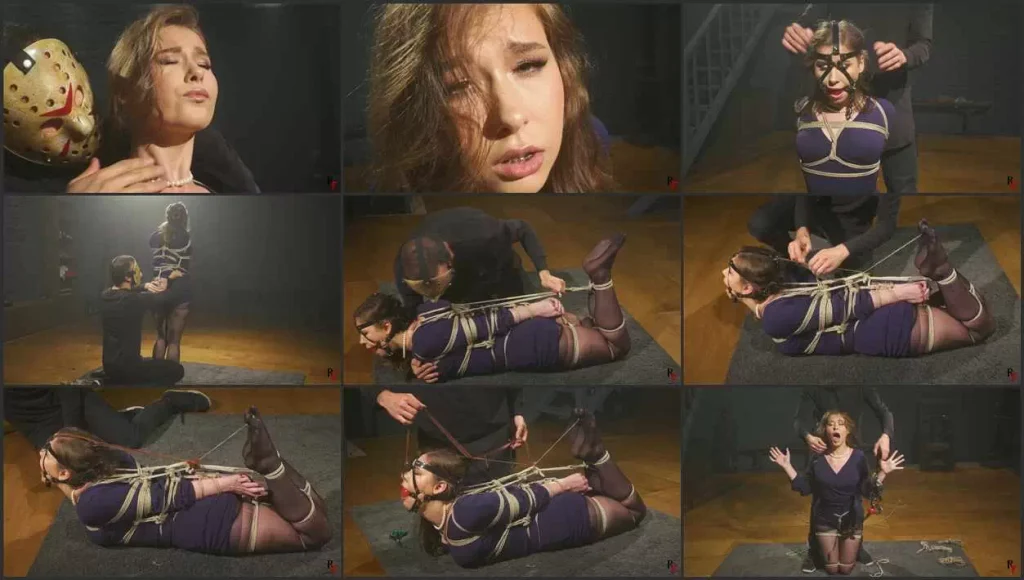 Throughout the clip, Patty appears in a blue dress and black sheer pantyhose, keeping this elegant outfit from start to finish. The focus is on rope aesthetics, posture, restriction, and Patty’s expressive reactions as the binding becomes more precise and controlled.