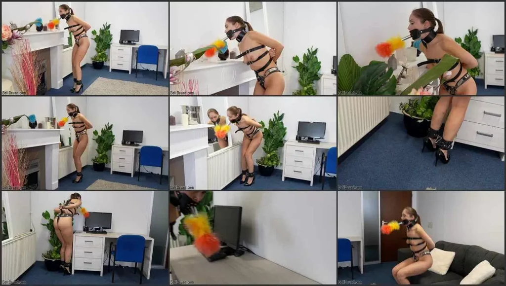 Rachel Adams is the perfect maid! She doesn’t even need her hands to clean the room. I strapped her into this box tie body harness, so her hands are out of the way. I locked her ankles together so she can only take tiny steps in her high heels…