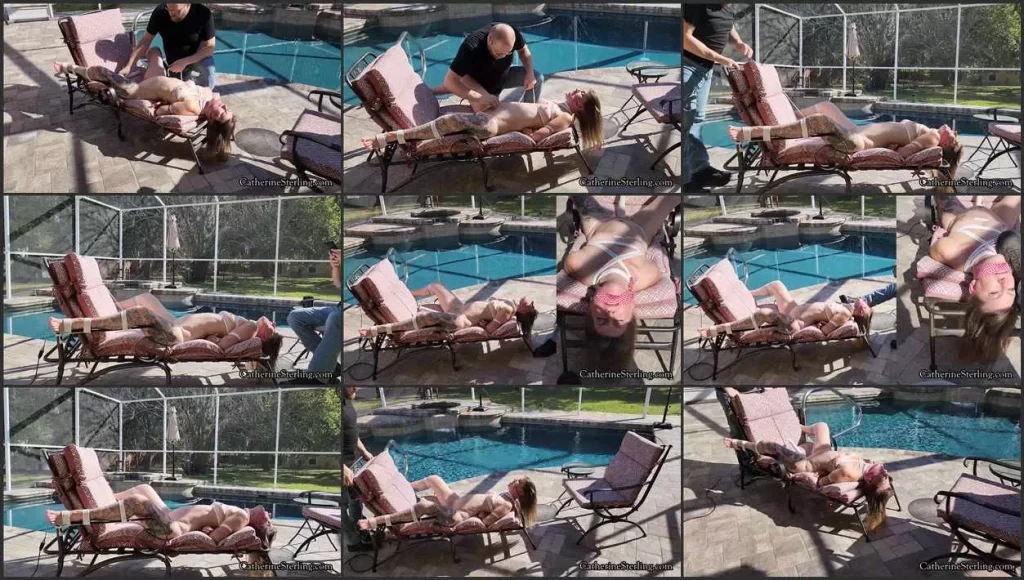 Preoccupied Poolside Pretty’s Persistent Pleasure with Bondage Orgasms on the Deck, for Spread Legged, Tattooed Totty Ms Sterling, Tied to a Poolside Lounge Chair!