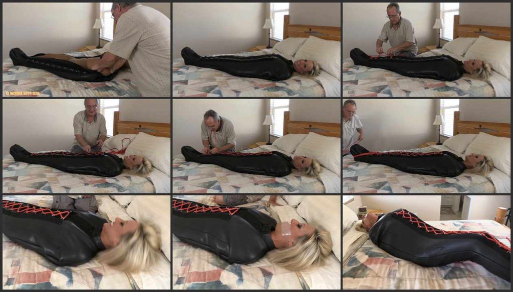 In a day of firsts for my lovely new friend, I asked Carolina after First Hood Feelings if she would like to try a bondage sack. She gave me a look I was becoming used to by now. Something along the lines of, “Oh gosh no … well, okay!” After Carolina introduces herself and wonders out loud about her partner who says she is pretty, yet hoods her, and thinks she has a fabulous body, but wants to put it in a sack, the presentation is all about getting her neoprene rubber confined. I help get her arms into the inner sleeves, then while zipping her up explain the frisky business option the triple zipper affords, and to tighten things up, apply red rope lacing along the length of the sack, finishing the security by tying it off to a bedpost. Carolina is a happy smiling girl throughout, and as well quite content to have her mouth stuffed with cloth and taped over with translucent duct tape. She could take a bigger wad but that is okay. With her lips closed the finished product is a perfect gag kiss. I challenge her to push her gag out but it does not budge. Sometimes I think bondage girls do not want to push their tape gag off. Now that I have Carolina helpless, I begin to verbalize perilous innuendo that she did not sign up for, which in turn prompts fabulous damsel in dismay reactions by the blonde beauty queen. After all, she did just meet me and perhaps my original gentlemanly manner was just a facade masking an inner demon.