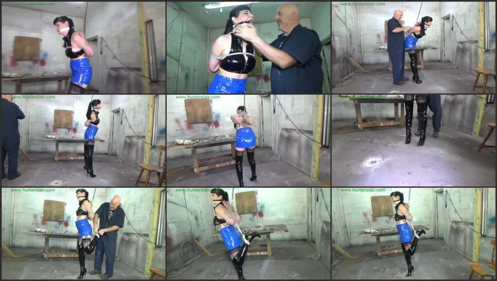 Sexy raven haired Nyxon struggling in the lair tethered to a chain hanging dowm from an overhead pulley. Her arms are twisted up behind her back in an evil reverse prayer. Her hands are pushed up high between her shoulder blades with more ropes pulling her elbows closed at the small of her back. White elastic bandage is pulled deep between her red lips to keep her quiet. Nyxon twists and turns pulling desperately at the ropes and chain to no avail. The Hunter comes back with more ropes with poor Nyxon still has helplessly and tightly bound and gag as when he left. He grabs pulls a roll of thin shiny black tape out of his pocket and wraps it tightly over her white cleave gag. The gag is pulled deep between her red lips forcing her mouth open. The Hunter goes over the the winch attached to the chain tied to her bondage and cranks it tighter with and electic wench. He gets more rope and wraps them tightly around her biceps, just above her elbows, then pulls the ropes tight pressing her elbows closer together and pushing her fingers up to the base of her neck. Nyxon moans and cries through her gag as the ropes are pulled bow string tight and wrapped around her chest and belly. The winch is then cranked even tighter rendering her unable to move around much at all. Another rope is then tied to her booted ankle then her pulls her foot off the floor and tethers the rope tied to her ankle to the ropes around her painfully bound arms. Poor Nyxon is left struggling to maintain her balance on one thin stiletto heel with her other stiletto heel pulled up to her ass. She begs and pleads through her gag up there is no one to hear her pitiful sobs and cries for help.