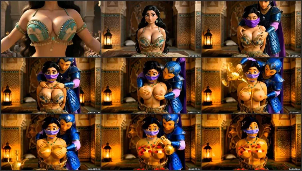 Bra pulled down, Dalia’s huge bare tits are fully exposed. Warm golden oil is poured from an ancient lamp over her breasts, collarbone and shoulders, then sensually massaged in. Red rose petals are sprinkled and perfume sprayed across her glistening skin. Final tender kiss on the cheek from the guard before she leaves Dalia bound, gagged, oiled and waiting for the prince’s arrival.