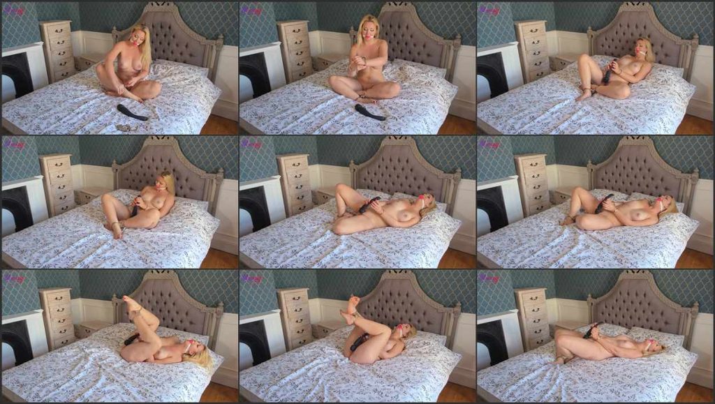 Missy’s curvy body quivers on the bed, her blonde hair framing her flushed face as she reaches for the metal cuffs first, securing them around her ankles with a soft click – trapping her in place, legs crossed just enough for teasing restriction. Her breasts heave with each breath as she picks up the ball gag next, inserting it between her lips and fastening it tight.