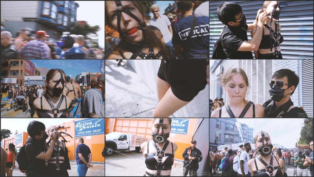 Folsom Street Fair is an annual BDSM and leather subculture street fair held in September, that caps San Francisco’s “Leather Pride Week”. Watch Rachel Adams gets publicly tied up and gagged and see how the crowd reacts, The clip starts by Rachel already bound in a leather armbinder and corset, awaiting be be harness gagged. After the 1st gag is applied, she walks around the streets in the red harness gag. Between changing gags we briefly interviews how Rachel feels abound being shamed in public. Next the panel gag is applied to her and watch her walk in her leather restraints. We sure turned some heads! To our surprise, girls turn heads more often than guys, maybe they want to be in that position! Next the panel gag is taken off for the latex full head gasmask, watch Rachel walk in this latex mask. We had to take the mask off shortly due to the hot weather or else Rachel will faint… Finally, our signature drain plug gag is applied to her and she walks a bit in restraints at Folsom. At the end there’s a 30 sec photo slideshow of Folsom highlights! Such as running into friends and some onlookers reaction caught on camera!! Definitely must watch for such an unique experience, only happens once a year here at SF!!