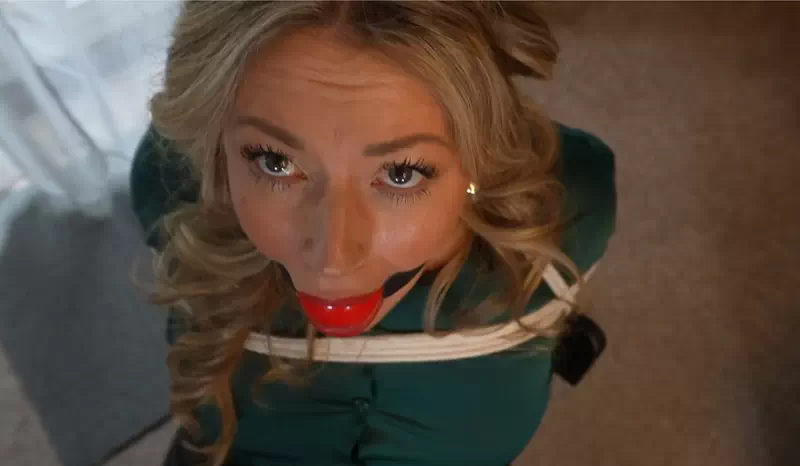 Rachel is waiting on Mr. Big Boss with her wrists and elbows already bound when he enters with a red ballgag and praise for how her first day went. She struggles a bit standing in her high heels and leather skirt before being moved to the hearth where she’s seated and her legs bound tightly. She’s then untied and made to strip before being retied in her lingerie and gagged with mouth packing and silver tape. She’s finished off with a hogtie in her shiny pantyhose and heels with Mr. Big Boss heading off to lunch for a couple of hours. She does manage to lose her shoes in the struggle