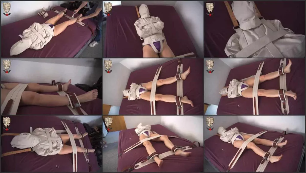 Rachel Adams needs to go to bed – strapped in a Maxcita Psycho II Straitjacket and hood wearing shiny satin panties. After some tickling I to exhaust her I leave her to rest in tight in the Humane Restraint bed restraints. Nighty night Rachel and don’t be afraid of the darkness! Hot helpless fun and a test pilot for more future videos of that kind.