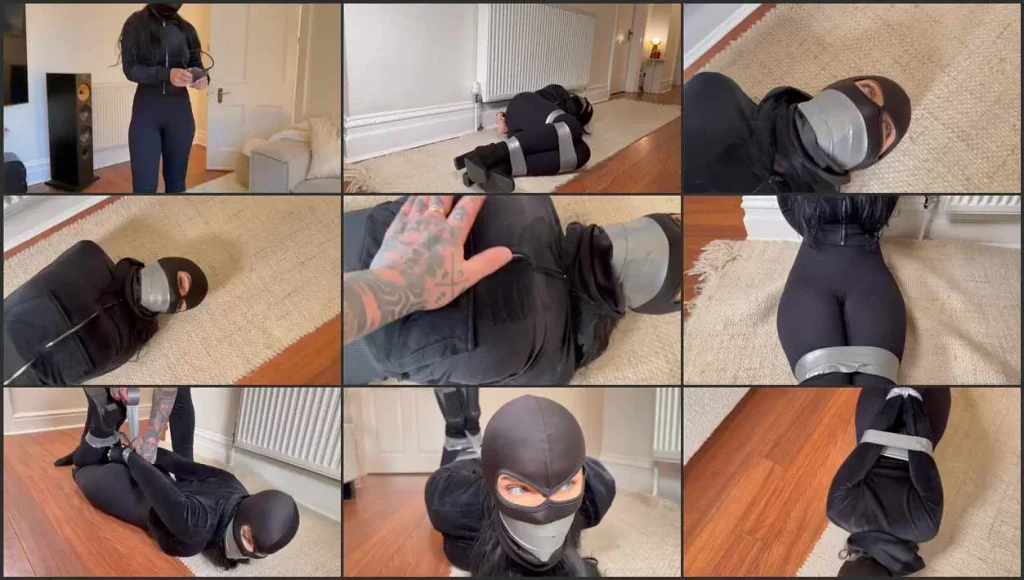 Moments later, Tatti is tape-bound right there on the floor where she almost escaped. Her legs are wrapped tightly together, a thick strip of tape pressed over her mouth and wrapped around her head makes her cheeks bulge beneath her balaclava, and her wrists are taped securely behind her back. She writhes and squirms, testing every knot.