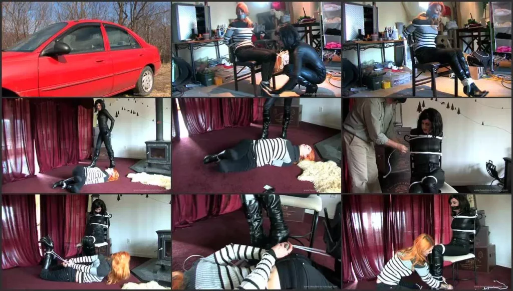 Kaitlin teams up with Scarlett in this tale of robbery and betrayal. Scarlett is working in a back office at a bank, responsible for sending out orders for checkbooks and other related documents. She’s behind with her work and is staying late to catch up. Kaitlin sneaks up behind the girl and clamps a hand over her mouth, threatening to hurt her if she doesn’t do as she is told. Kaitlin zips Scarlett’s wrists behind her back and gags her with duct tape. Scarlett is led from the building. She is transported in the trunk of a car to a remote house, then taken into the basement where she is tied to a chair. Kaitlin removes the girl’s gag and demands the code to the bank’s vault. When Scarlett says she doesn’t have it, Kaitlin re-gags her and explains that someone is coming who will make her talk. Later, Scarlett is taken upstairs and placed in a hogtie just before Kaitlin’s partner arrives. His threats to Scarlett are far more effective and the girl gives up the code. Now he has the information, Kaitlin’s boss says that he no longer needs her and overpowers her. Kaitlin is shocked and then angry as she is tied to a chair and gagged. Even the best laid plans can go horribly wrong. Left alone and seemingly united by their mutual plight, the two girls agree to help one another get free, but this arrangement backfires for Kaitlin.