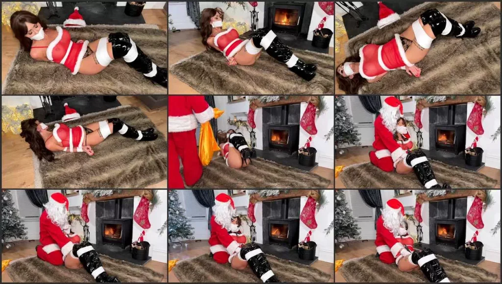 Brunette beauty Scarlett Rose (18+, all participants 18+) is dressed in a sexy festive red dress, Christmas hat, and knee-high boots, playfully role-playing a “naughty gift” in a light-hearted, fully consensual holiday fantasy. Tied with soft festive ribbon and wearing a playful gag as part of the scene, she wriggles and teases on the floor in front of the crackling log fire, putting on a seductive show while an Elf on the Shelf cheekily looks on.