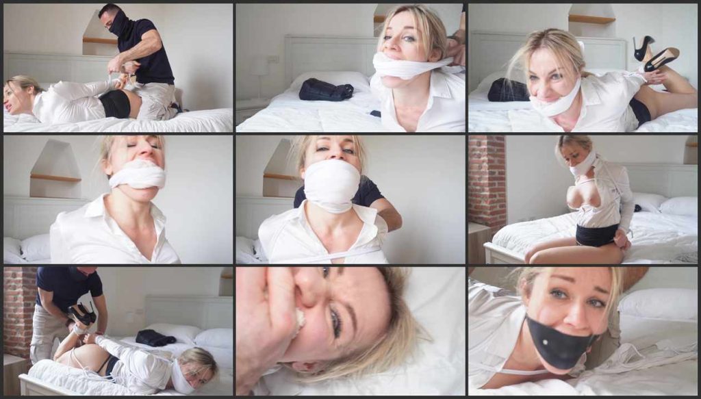 Her feet and elbows are also tied up. The revenge has only just begun. He continues his work with a chest harness and adds an OTM over the cleave gag! The gag escalates! Pamela tries to express her rage through the sock in her mouth, but all we hear is “MMMmmmmggghhhhrr”!