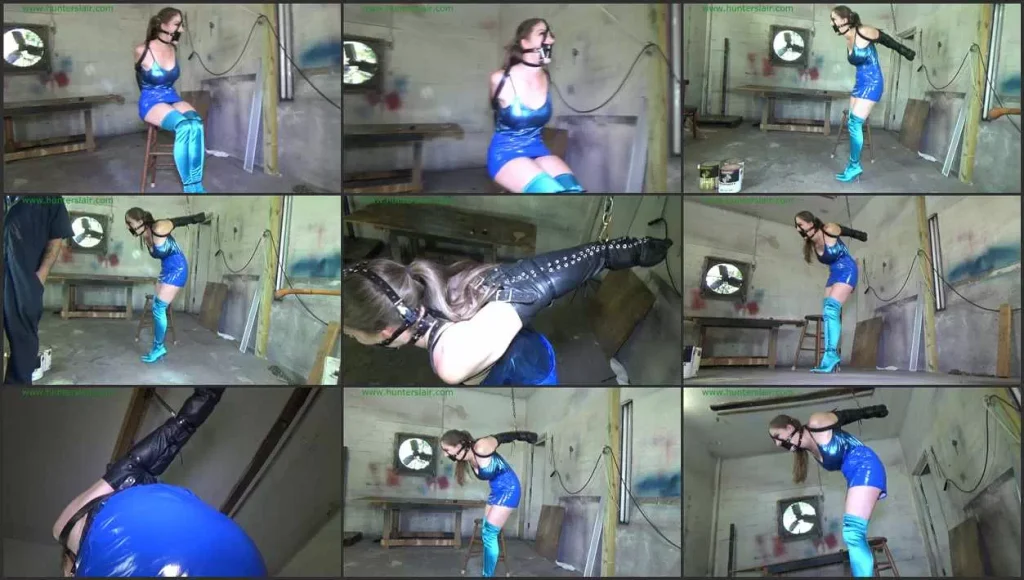 Leggy Terra sits on a tall stool helplessly bound and gagged. She can feel her poor arms pressed tightly together behind her back encased in a single sleeve leather arm binder. She can also feel the tight embrace of hard nylon zipties slicing deep into the soft leather arm binder around her wrists and elbows. More zipties fuse her booted legs tightly together are pulled tight around her ankles and knees. A big rubber pulls is jammed between her teeth held in place by a panel gag wrapped tightly around her head. She struggles helplessly on the stool but there is no way out of the leather arm binder that is ziptied around her arms. The Hunter comes in and Terra begs and pleads with her to please let her go through her gag. But the Hunter ignores her cries as he pulls her to her feet and attaches a chain hanging down from an overhead pulley tothe tight ziptie around her wrists. He the cranks the winch on the other side of the room lifting her uselessly bound arms up high behind her back. He keeps cranking the winch twisting and stretching her poor shoulders in their sockets as she moans in pain. He leaves her alone to suffer in the cruel strappado from which there is no escape.