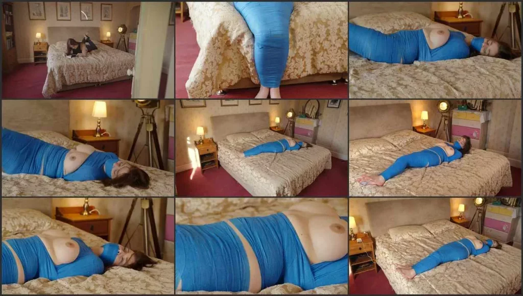 Amazing buxom babe Lottii Rose is chilling on her bed reading when an intruder bursts in! She is soon wrapped from neck to ankle in tight smothering blue vet wrap, mummified and helpless, her moans and cries muffled by more vet wrap over her mouth. The intruder perves over her struggles and kicks, of course he’s left her big natural boobs free to bounce with every kick, and her feet free too so he can ogle her soles. When she runs out of steam he wires her up to a TENS unit, one electrode on each sole, and zaps her to encourage continuing jiggles!