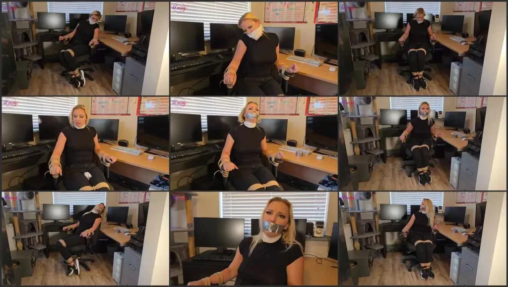 International infiltrator Missy finds herself in deep trouble. Restrained to a desk chair with rough ropes, she writhes desperately against her bindings. Her wrists are secured long the armrest, ankles and knees bound to the chair. A Thick cloth covers her mouth, muffling her angry protests.