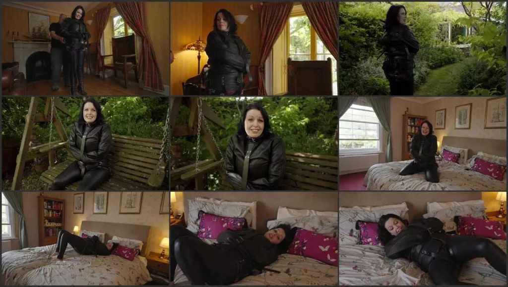 Temptress Kate is back at the Restrained Elegance house and reminiscing about past shoots and bondage adventures as she is strapped into a heavy black leather straightjacket and leg irons. We chatter away and take a turn around the garden, as if Straightjacket Sunday were a perfectly normal part of our weekly routine. Then it is time for a real challenge- can Kate possibly escape from the clutches of the straightjacket? I allow her use of her feet by undoing the leg irons, but I don’t hold out much hope that she can make any progress in escaping. Shall we see if I am right?