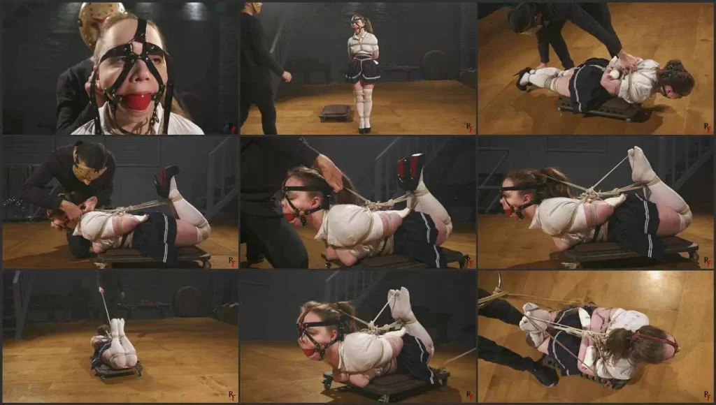 The clip begins with her standing in the middle of the room as a harness-style ballgag is secured over her head. Soon after, she is placed on a special rolling cart platform and tied into a strict rope hogtie. Her wrists are bound in a tight box-tie position, wrapped with microfoam tape for extra tension, while her big toes are tied together over the stockings and pulled toward her bound hands.
