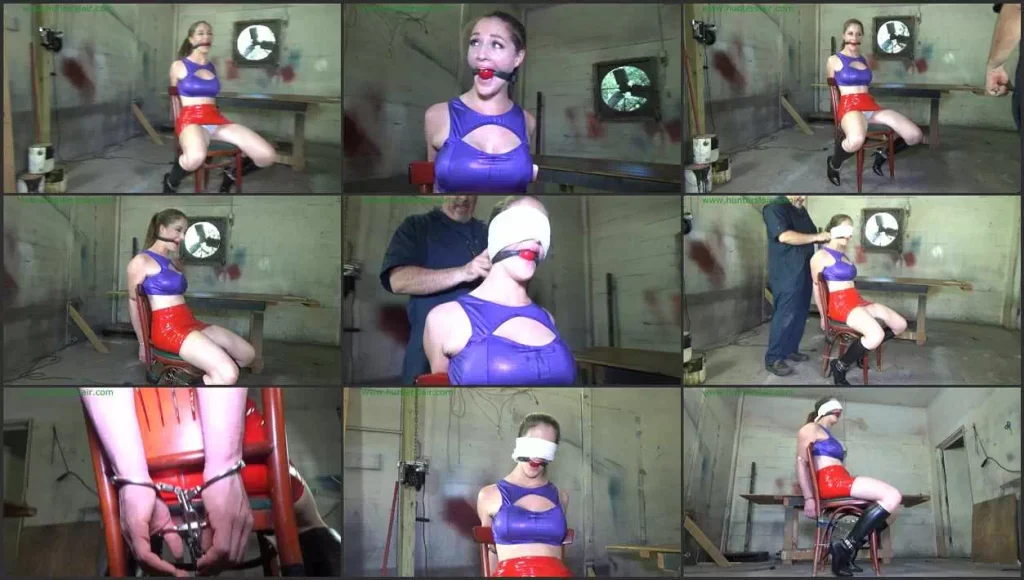 Busty Terra sits on an old chair in the lair with her arms cuffed tightly together behind her back in steel handcuffs. A set of cuffs is locked around her wrists and another around her elbows, pressing them close together. Her poor thumbs are cuffed together by a set of thumbcuffs and her booted ankles are cuffed, pulled back and chained to the rear of the chair. A big red ball gag is jammed between her teeth to keep her quiet. Terra begs and pleads through the gag for help as drool flows down her chin and covers her big spandex covered tits. The Hunter comes in to add to her discomfort with a short chain attached to her wrist cuffs then the chain is run down under the chair and locked to to a crossmember so now she can’t move her arms at all. Then to mkae matters worse he ties a white cloth blindfold around her eyes and leaves her alone in the dark not knowing what will happen to her next.