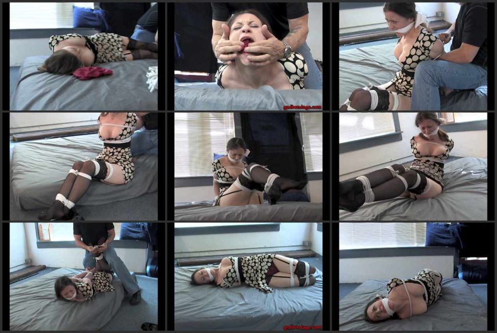 He takes Serene her into an abandoned building and throws her down on a mattress. Using several hundred feet of rope, he roughly ties her up. When Serene starts making too much noise, he stuffs a big pair of panties in her mouth and then ties a rag very tightly between her teeth to gag her. When Serene is left alone, she struggles hard to get loose. She is able to sit up and work her way off of the mattress. But as she tries to crawl away, the man comes back and grabs her. After dragging her back to the mattress, Serene is hogtied with her dress and bra pulled down. The video ends with Serene’s ransom paid. The man comes back in the room and lifts Serene over his shoulder so he can carry her to his car. She will be driven to some deserted place and left there to be found.