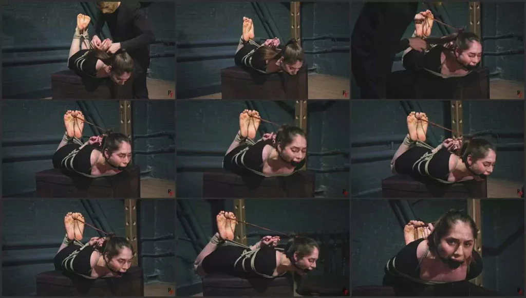 Her breathing is deep, her movements are limited, and every subtle wiggle shows how snug the ropes are. She moans softly and struggles on the stand, testing the tension but unable to gain even a few centimeters of freedom.