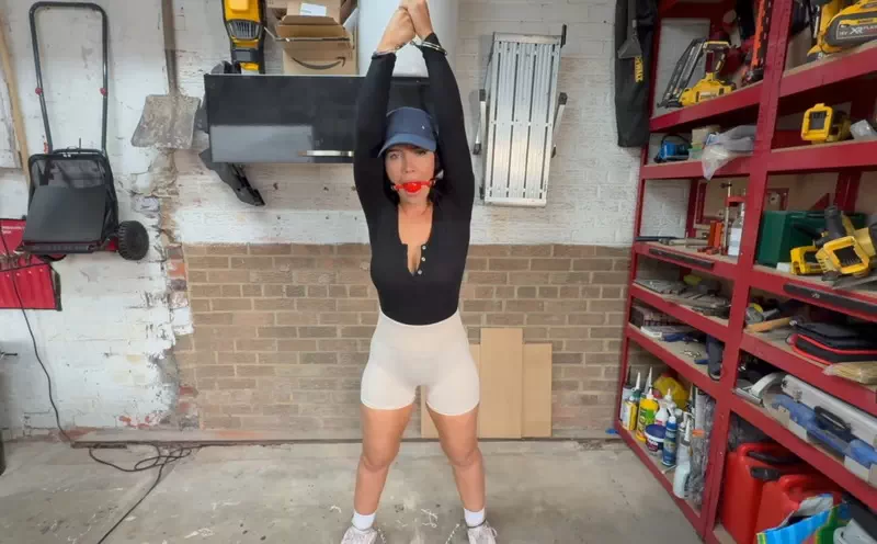 Bella starts the scene by applying a microfoam tape gag over her mouth and covering it with a stretchy thin sheer white cotton mask. Then she heads out for a little walk. From time to time she takes off her mask to flash the tape gag underneath it. In the end, she takes off the mask and peels of the tape gag (with lip-print on it). One outtake of Bella putting on the mask is shown in the end.