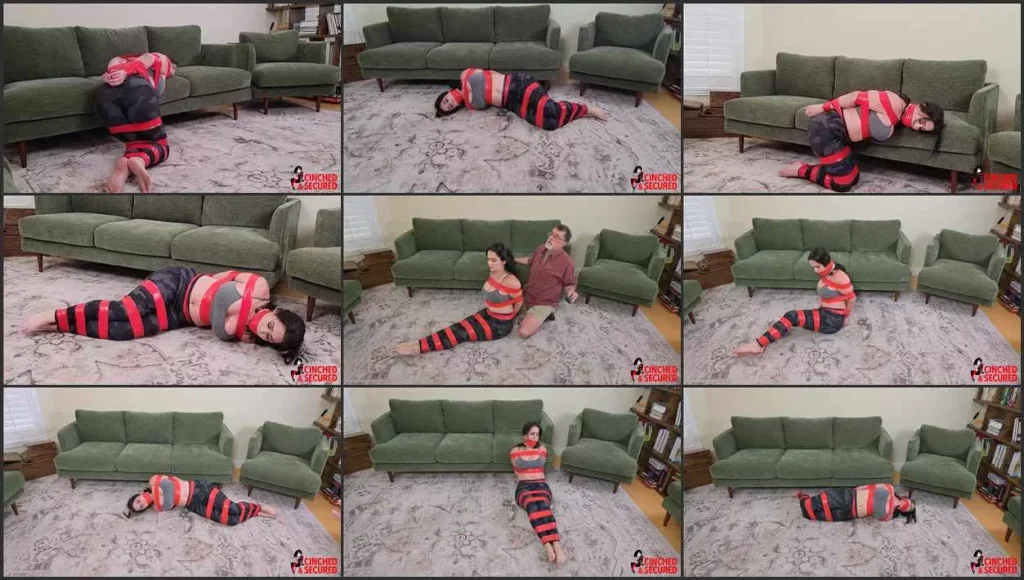 All Tilly wanted was a workout, and she definitely got it! Tightly bound in her exercise clothes with endless bands of super sticky tape, she tried to call for help, but the strangers hand gripped her face like a vice, sealing her screams beneath the stranger’s palm. Without warning, his fingers pried her mouth open and packed it full of an old dirty cloth! Grunting, she struggled as he wrapped medical bandage tightly around her face and secured THAT with multiple wraps of the same tape that fused her limbs together. Now confident she would be silent, the stranger left her to struggle! She thrashed and squirmed, every movement causing the horrid tape to pull at her tender skin and she quickly realized escape would be nearly impossible! Still, she had to try and so she wriggled and struggled, her big tits threatening to spill out of her top with every movement! Where was her captor? Was he watching? Were her struggles giving him other ideas? If so, there was little Tilly could do to stop him from acting upon them!