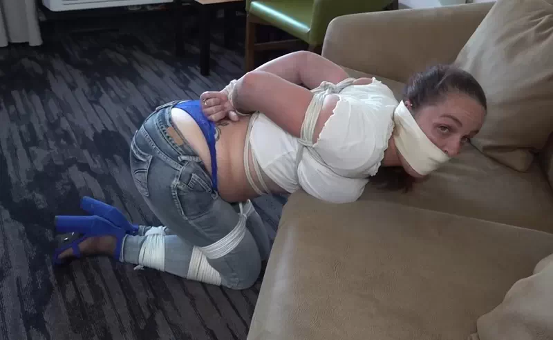 Now enjoy this hot feature at a discount! In the middle of the night, a dark figure sneaks into Lexi Holland’s bedroom. She slowly wakens when the intruder clamps his hand over her mouth. In her unsuspecting state, she can’t resist as the masked villain stuffs a foam ball between her lips and then uses a cleavegag to hold it securely in place. He pulls the long-haired beauty up and then tightly winds med-wrap around her head to make certain his luscious hostess stays quiet. Poor Lexi is still unable to fight as the villain pulls her face-down onto the bed to cruelly bind her hands behind her back. The black-clad baddie then sits Lexi up so he can tie her ankles. He moves her back onto the bed and into position so he can use a final rope to hogtie the barefoot babe. Lexi’s unwelcome guest then tells her he needs to make some preparations, and he warns her not to cause any problems for him. Once he’s left the room, the stunning brunette rolls around on the bed, desperately trying to escape from the ropes. As Lexi powerlessly struggles, her camisole nightgown becomes increasingly disheveled, riding up almost to her waist and also exposing her breast. Then the villain returns and his motives become clear. He’s talking to his employer, assuring his mysterious boss that the package is secured. But then the hired thug is told he’s in the wrong house — and he’s grabbed the wrong woman!