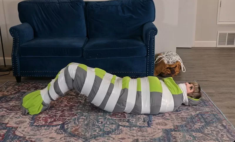 At first, Bramble is topless and ballgagged, gently massaging Mandy’s feet with her hands. When I approach, I tie Bramble’s arms behind her back in a tight, elegant box tie. Once she’s fully restrained, I remove the gag from her mouth and place her on her knees – her face now inches away from Mandy’s bare soles.