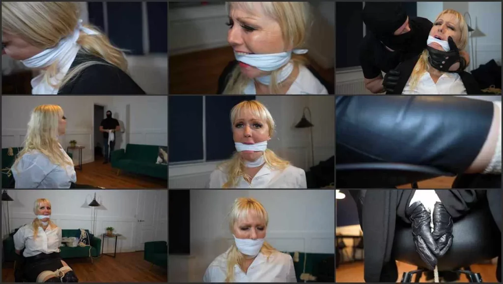 Sexy blonde babe Victoria gets grabbed after returning home. The sexy busty milf finds herself bound tightly to a chair. She struggles against her bonds before the stranger enters the room. Armed with handkerchiefs with intentions of gagging victoria and making her his handkerchief slave. He has been watching victoria for a while a he knows that Victoria uses handkerchiefs in her every day life. This turns the stranger on. The man then gags her with a handkerchief cleave gag and then another because after all one cleave gag is not enough. Victoria is left to struggle and cry into her gag for a while. The rope too tight to loosen. Firmly bound in her secretary clothes, boots and leather gloves the kink hankie loving milf tries defiantly. The man then returns, he teases her and ungags her to let her plead for a while. This is short lived and she is swiftly cleave gagged again with two fresh white handkerchiefs. Again Victoria is left to try and free herself. Some time passes before the handkerchief loving villain returns. This time he is holding her bag and he pulls out one of Victoria’s handkerchies and gives her a tight classic over the mouth damsel gag. Before he silences her with this he has her tell him she loves handkerchiefs. He also tells her his plans for her and tells her hes going to make her his handkerchief slave. Victoria is left for the last time to struggle and contemplate her fate.
