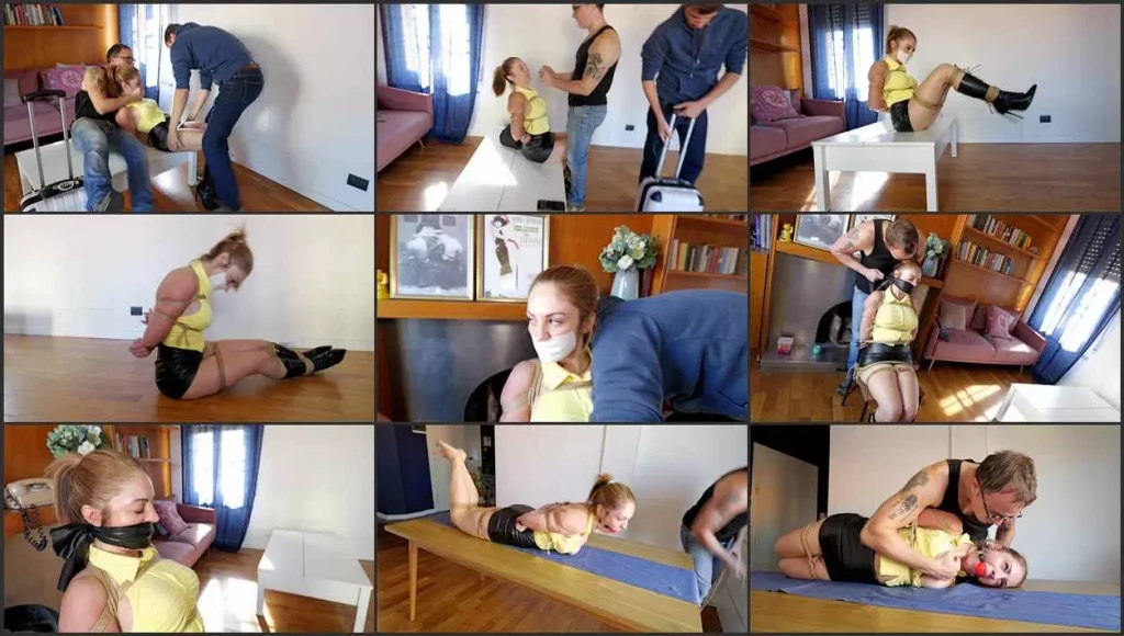 Left alone while the two men search her apartment, Alba begins to struggle. She twists, slides, and inches toward the hallway, trying to find something sharp. Her elegant outfit contrasts with the ropes biting into her skin, each movement making them tighter. She finally reaches another room — but before she can hide, the men catch her and bring her back…