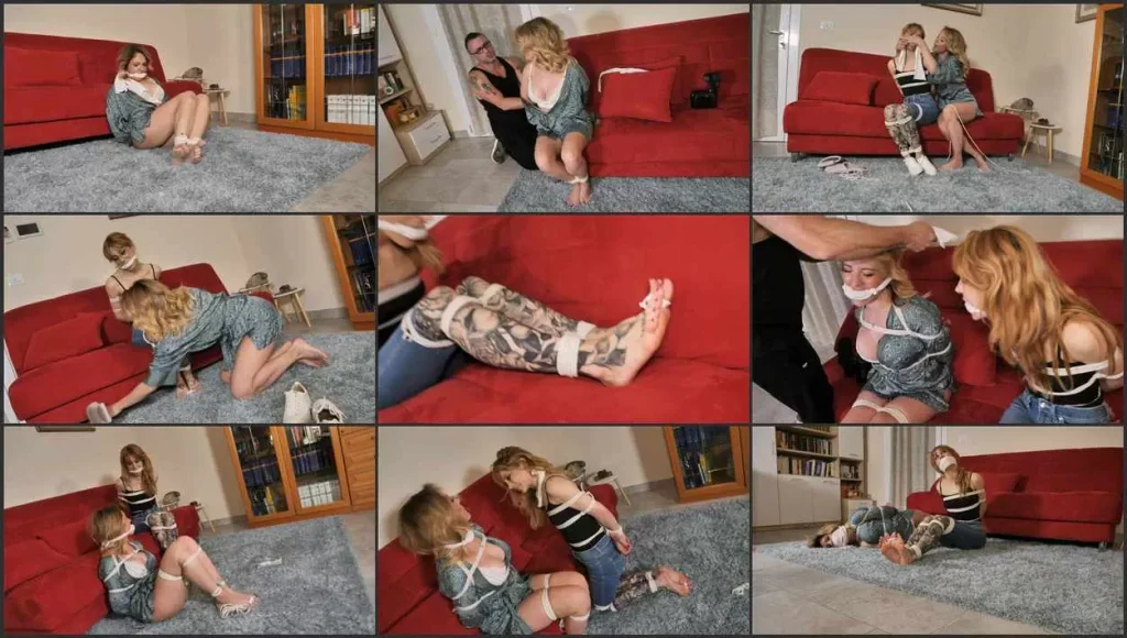 Sexy Alba, dressed in a short robe, bra and panties, is on the phone in her sitting room, when she’s attacked by an unknown intruder and left to struggle, bound hand and foot and cleave gagged. After a few minutes of sexy struggling, we see her heading to the door of the house to escape but an angry voice stops her. But it’s not the intruder. Someone even nastier. We see that Alba was playing in a movie. Cute Stella, the director, scolds Alba because she made a mistake during the escape scene. Alba, now pissed, complains through the gag that she’s cold be cold and tired to play in that movie, uncomfortably bound and gagged. More, Alba barely bears Stella’s arrogant and bossy attitude. Tony, the cameraman and producer, tries to mediate between the girls: they need to finish the movie fast, because the customer pays well and they are literally burdened by debts. Stella temporarily leaves the room and Tony unties Alba, to give her a little rest. When Stella comes back, Alba handgags her from behind, then thoroughly binds her. According to Alba, this treatment should teach Stella to be more sympathetic and to understand how Alba feels, in order to achieve a better teamworking. To add a little touch of humiliation (Alba claims to have been repeatedly humiliated by Stella), Alba removes Stella’s shoes and binds her big toes (Stella is notoriously foot-shy), then gags her with a cleave and Leaves her to struggle on the sofa…