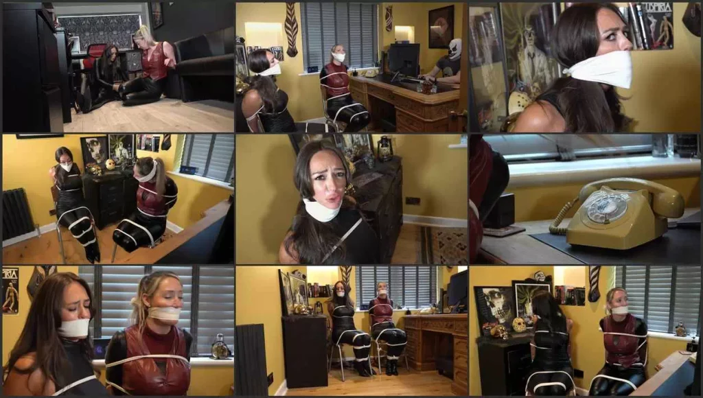 The girls watch helplessly, with mounting concern, as the freak discusses their fate. Later, and that weird pretty girl removes their gags for just a moment, to see if they will give up an info on their mission here today, but they will stubbornly refuse while allowing their free ‘mouth time’ to strategise some sort of ill-conceived escape bid. And, for this, they are tightly gagged and further restrained to their chairs for extra good measure. And THAT, is how they shall stay, heavily bound and sporting super tight cloth strips binding their mouths into blissful submission…