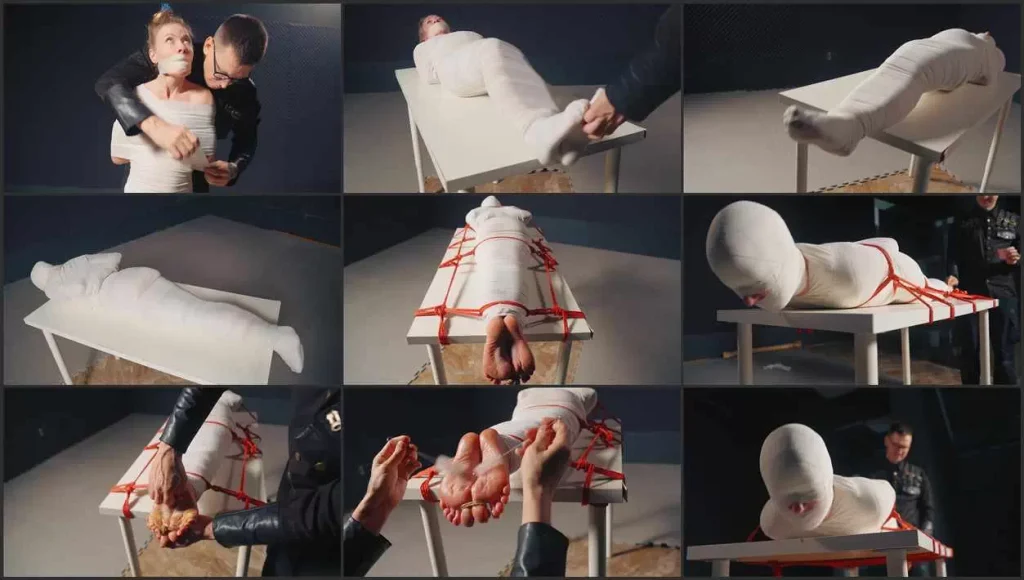 Since her feet are so sensitive, to continue, we have to tighten her bondage and tie her very tightly to the table with ropes. After this, we remove her socks and apply oil to her bare soles using a brush. Every brush stroke is very sensitive for her. We then continue the tickling with the brush, working quickly and thoroughly on her feet, leaving no area untouched. We continue the tickling, experimenting with special brushes, and then continue tickling with fingers…